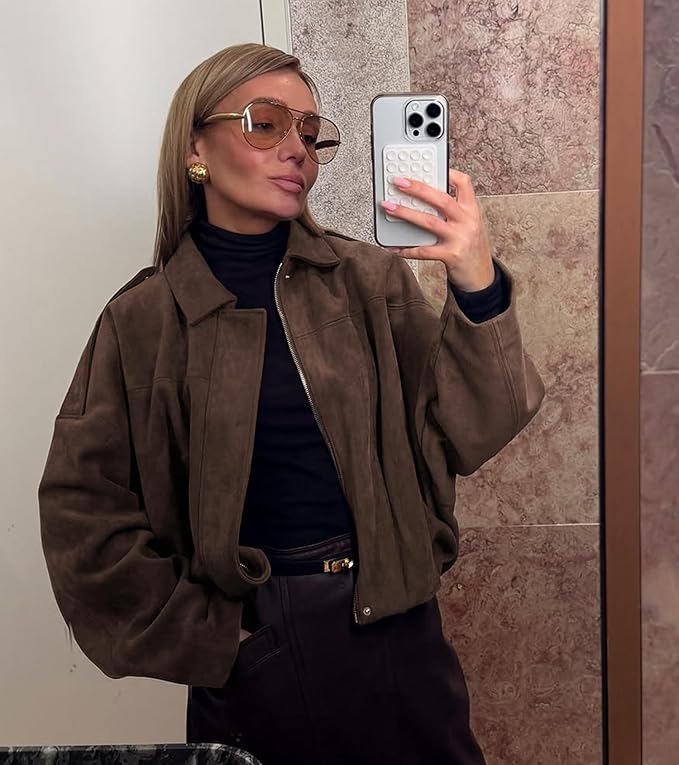 Die Suche nach der perfekten Übergangsjacke kann eine Herausforderung sein, doch die Damen-Jacke aus Wildlederimitat im Bomberjackenstil, mit lässigem Revers und übergroßem Schnitt, könnte genau das sein, wonach Sie gesucht haben. Sie vereint mühelos den robusten Charme einer Motorradjacke mit der entspannten Silhouette einer Bomberjacke und dem luxuriösen Gefühl von Wildlederimitat. Lassen Sie uns einen genaueren Blick auf dieses vielseitige Kleidungsstück werfen.